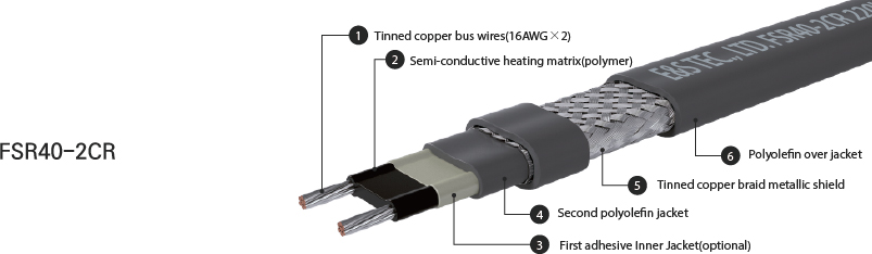 1. Tinned copper bus wires (16AWG x 2) – 도체 2. Semi-conductive heating matrix (polymer) – 발열체(반도성 폴리머) 3. First adhesive inner jacket (option) – 내부절연체 4. Second polyolefin jacket – 1차 절연외피 5. Tinned copper braid metallic shield – 편조 6. Polyolefin over jacket – 2차 절연외피