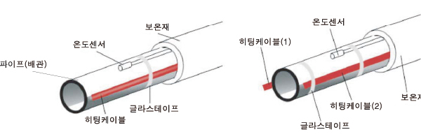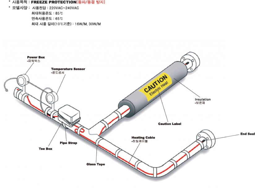 | Application | Description | Specific Application Requirements | 일반적인 수도배관 | 동파방지를 위해 최소 4℃ 이상 유지 금속 또는 플라스틱 수도관에 적용 | 전원연결키트, 온도센서, 앤드캡 | | 하수배관 | 흐름유지를 위해 43℃ 유지 | 전원연결키트, 온도센서, 온도조절기, 스플라이스, 앤드캡 | | 연료배관 | 흐름유지를 위해 40/60℃ 유지 | 전원연결키트, 온도센서, 온도조절기, 스플라이스, 앤드캡 |