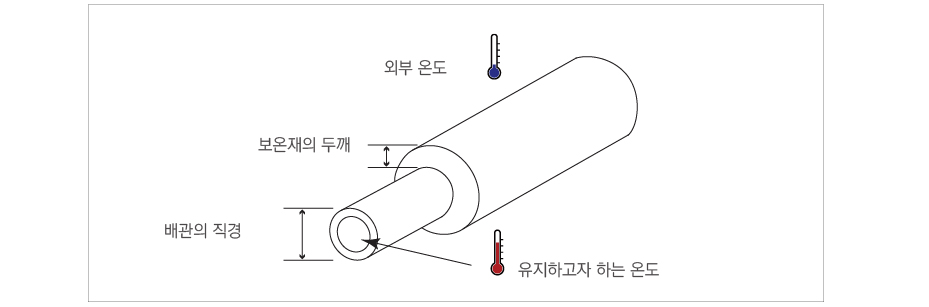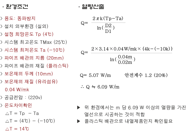 제공되는 공식은 배관이 일정한 온도의 유체가 채워지고 균일한 보온재 등의 외장이 시공되어 있는 상태를 산정하며, 외기에 노출된 겉표면 온도와 배관 내부온도의 차이를 통해 시스템이 유지되기 위한 최소한의 열량을 구할 수 있다.
