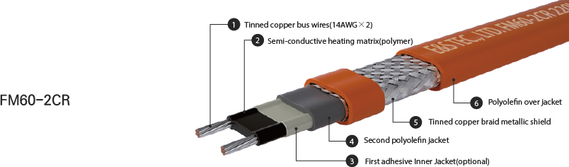 1. Tinned copper bus wires (16AWG x 2) – 도체 2. Semi-conductive heating matrix (polymer) – 발열체(반도성 폴리머) 3. First adhesive inner jacket (option) – 내부절연체 4. Second polyolefin jacket – 1차 절연외피 5. Tinned copper braid metallic shield – 편조 6. Polyolefin over jacket – 2차 절연외피
